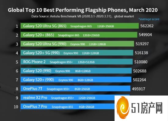 从第4名到第10名,他们将由三星Galaxy S20 5G(Exynos 990)、华硕ROG手机2、三星Galaxy S20(Exynos 990)、三星Galaxy S20 (Exynos 990)、一加7T、Realme X2 Pro和一加7 Pro组成。