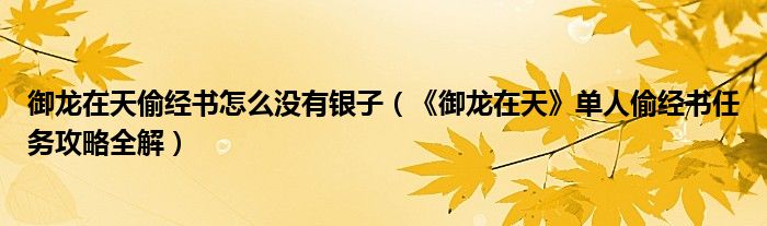 导读 大家好,太太来为大家解答以上问题。御龙在天偷经书怎么没有银子,《御龙在天》单人偷经书任务攻略全解很多人还不知道,现在让我们一起来看