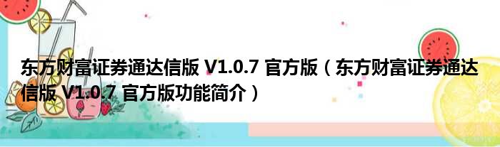 导读 大家好,关于东方财富证券通达信版 V1 0 7 官方版,东方财富证券通达信版 V1 0 7 官方版功能简介这个很多人还不知道,小勒来为大家解答以