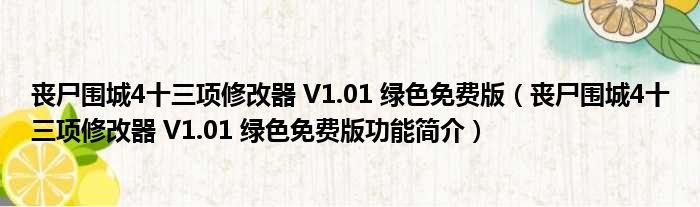 导读 大家好,关于丧尸围城4十三项修改器 V1 01 绿色免费版,丧尸围城4十三项修改器 V1 01 绿色免费版功能简介这个很多人还不知道,小勒来为大