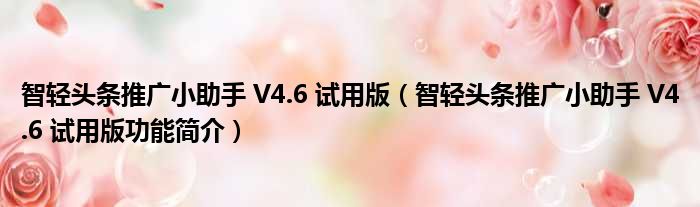 导读 大家好,关于智轻头条推广小助手 V4 6 试用版,智轻头条推广小助手 V4 6 试用版功能简介这个很多人还不知道,小勒来为大家解答以上的问题