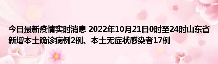 您的位置:首页 >房产频道 > 综合精选 > 今日最新疫情实时消息 2022年10月21日0时至24时山东省新增本土确诊病例2例、本土无症状感染者17例 2022-10-22 18:20:13 • 来源: 导读 免责声明:本文由用户上传,如有侵权请联系删除! 上一篇:今日最新疫情实时消息 2022年10月21日0时至24时山东省新增本土确诊病例2例、本土无症状感染者17例 下一篇:今日最新疫情实时消息 广西新增本土确诊病例1例、本土无症状感染者6例