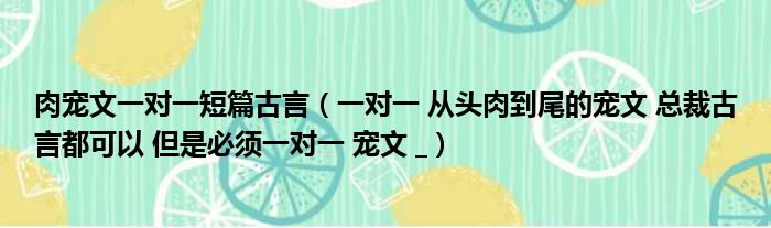 导读 大家好,今天小六子来为大家解答以下的问题,关于肉宠文一对一短篇古言,一对一 从头肉到尾的宠文 总裁古言都可以 但是必须一对一 宠文