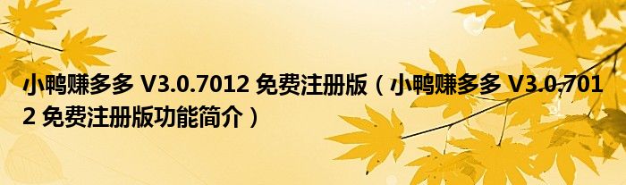 导读 大家好,关于小鸭赚多多 V3 0 7012 免费注册版,小鸭赚多多 V3 0 7012 免费注册版功能简介这个很多人还不知道,小勒来为大家解答以上的问