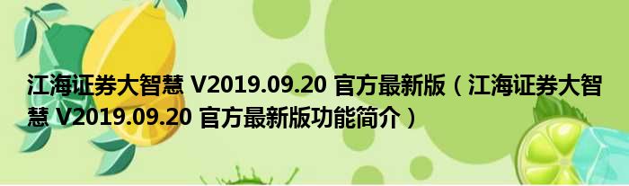 导读 大家好,关于江海证券大智慧 V2019 09 20 官方最新版,江海证券大智慧 V2019 09 20 官方最新版功能简介这个很多人还不知道,小勒来为大家