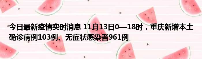 11月13日0—18时,重庆市新增本土确诊病例103例(秀山县24例,沙坪坝区17例,开州区、垫江县各10例,渝中区7例,奉节县6例,云阳县5例,江北区、梁平区各4例,渝北区、巴南区各3例,涪陵区、长寿区、綦江区各2例,九龙坡区、璧山区、忠县、石柱县各1例);新增无症状感染者961例(九龙坡区271例,渝北区196例,沙坪坝区106例,垫江县59例,南岸区50例,合川区46例,巴南区42例,巫溪县35例,江北区30例,大渡口区27例,北碚区15例,秀山县12例,江津区11例,渝中区10例,璧山区8例,綦江区7例,铜梁区5例,万州区、涪陵区、开州区、云阳县各4例,长寿区、城口县、奉节县、巫山县各2例,永川区、南川区、大足区、梁平区、丰都县、酉阳县、彭水县各1例)