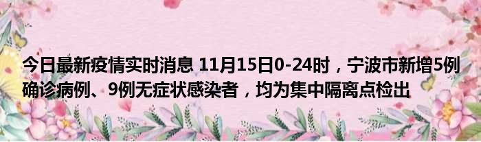 您的位置:首页 >房产频道 > 综合精选 > 今日最新疫情实时消息 11月15日0-24时,宁波市新增5例确诊病例、9例无症状感染者,均为集中隔离点检出 2022-12-04 23:24:17 • 来源: 导读 免责声明:本文由用户上传,如有侵权请联系删除! 上一篇:房贷利息怎么算最简单的方法(房贷利息怎么算) 下一篇:今日最新疫情实时消息 江苏11月15日新增本土确诊病例25例、本土无症状感染者126例