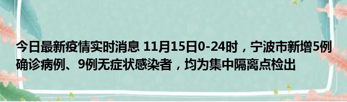 您的位置:首页 >房产频道 > 综合精选 > 今日最新疫情实时消息 11月15日0-24时,宁波市新增5例确诊病例、9例无症状感染者,均为集中隔离点检出 2022-12-05 21:52:14 • 来源: 导读 免责声明:本文由用户上传,如有侵权请联系删除! 上一篇:高尿酸血症饮食禁忌及食谱表(高尿酸血症的饮食注意事项) 下一篇:今日最新疫情实时消息 新疆11月16日新增确诊病例26例、无症状感染者901例