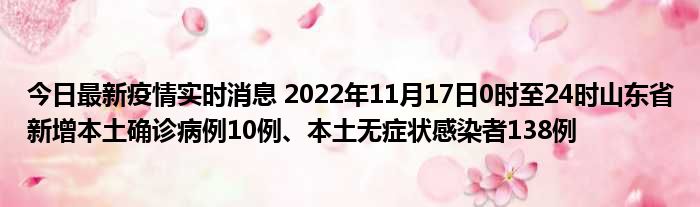 您的位置:首页 >房产频道 > 综合精选 > 今日最新疫情实时消息 2022年11月17日0时至24时山东省新增本土确诊病例10例、本土无症状感染者138例 2022-12-08 08:12:15 • 来源: 导读 免责声明:本文由用户上传,如有侵权请联系删除! 上一篇:今日最新疫情实时消息 浙江11月17日新增本土确诊病例16例、本土无症状感染者34例 下一篇:今日最新疫情实时消息 海南11月17日新增本土确诊病例2例、本土无症状感染者7例