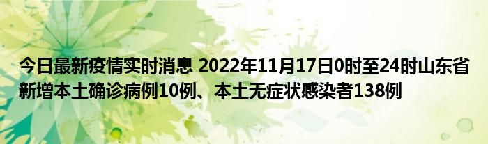您的位置:首页 >房产频道 > 综合精选 > 今日最新疫情实时消息 2022年11月17日0时至24时山东省新增本土确诊病例10例、本土无症状感染者138例 2022-12-08 14:58:16 • 来源: 导读 免责声明:本文由用户上传,如有侵权请联系删除! 上一篇:狗年是哪几年的(狗年是哪些年) 下一篇:电脑怎么截图快捷键win10(电脑怎么截图快捷键)
