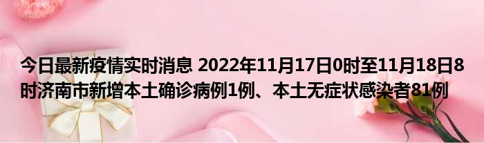 您的位置:首页 >房产频道 > 综合精选 > 今日最新疫情实时消息 2022年11月17日0时至11月18日8时济南市新增本土确诊病例1例、本土无症状感染者81例 2022-12-13 02:28:14 • 来源: 导读 免责声明:本文由用户上传,如有侵权请联系删除! 上一篇:东北人冬天一般穿什么(东北人冬天一般穿什么) 下一篇:今日最新疫情实时消息 江苏11月17日新增本土确诊病例21例、本土无症状感染者121例