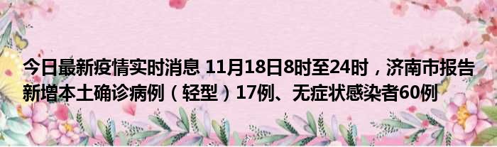 您的位置:首页 >房产频道 > 综合精选 > 今日最新疫情实时消息 11月18日8时至24时,济南市报告新增本土确诊病例(轻型)17例、无症状感染者60例 2022-12-14 00:58:16 • 来源: 导读 免责声明:本文由用户上传,如有侵权请联系删除! 上一篇:今日最新疫情实时消息 海南11月18日新增本土确诊4例、本土无症状7例 下一篇:今日最新疫情实时消息 广西11月18日新增本土确诊6例、本土无症状72例
