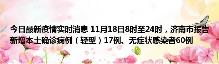 您的位置:首页 >房产频道 > 综合精选 > 今日最新疫情实时消息 11月18日8时至24时,济南市报告新增本土确诊病例(轻型)17例、无症状感染者60例 2022-12-14 21:34:14 • 来源: 导读 免责声明:本文由用户上传,如有侵权请联系删除! 上一篇:两个孩子离婚怎样才能不要孩子(两个孩子离婚怎么分配) 下一篇:今日最新疫情实时消息 广西11月18日新增本土确诊6例、本土无症状72例
