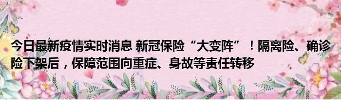您的位置:首页 >房产频道 > 综合精选 > 今日最新疫情实时消息 新冠保险“大变阵”!隔离险、确诊险下架后,保障范围向重症、身故等责任转移 2023-01-03 22:42:15 • 来源: 导读 免责声明:本文由用户上传,如有侵权请联系删除! 上一篇:今日最新疫情实时消息 香港12月17日至23日新增3宗类鼻疽感染确诊个案 下一篇:千手柱间vs宇智波斑(千手柱间)