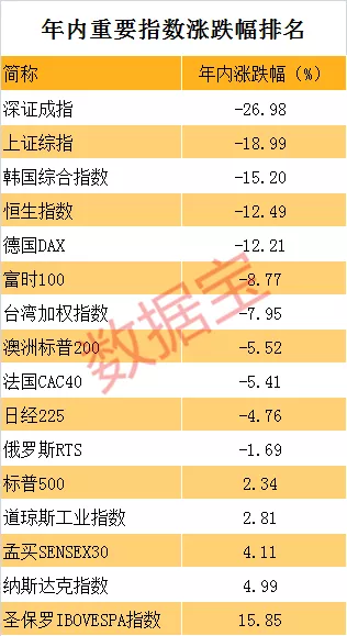 在房地产市值高歌猛进的时候,中国股市却出现了连续的调整,今年以来各大指数更是出现创出近年来新低的表现。截至最新,上证指数今年以来累计跌幅超过18%,创业板指跌幅超过20%,深证成指大跌近27%。各大指数熊冠全球,深证成指位居全球重要指数跌幅榜第一位,上证指数跌幅位居全球重要指数跌幅榜第二位。