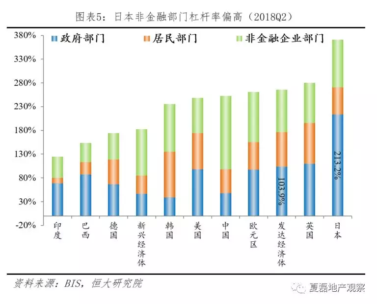 政府部门杠杆水平高。2018年2季度,日本非金融部门负债与GDP之比高达370.7%,远高于发达经济体265.9%的平均水平,在主要经济体中排名第一。其中,日本政府部门杠杆率高达213.2%,比发达经济体103.9%平均值高一倍。