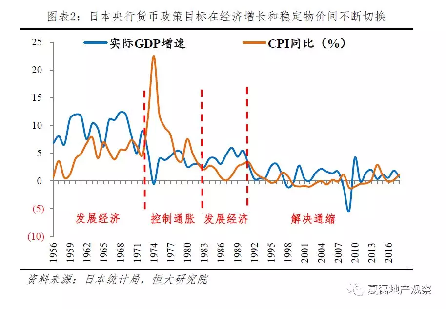 货币政策定力不足,调控目标在经济增长和(86.2, 0.20, 0.23%)稳定物价之间不断切换。战后日本央行的首要目标是为经济增长提供充足资金;70年代因两次石油危机,货币政策目标转向控制通胀;1985年“广场协议”签订后日元升值抑制出口,央行的目标重回经济增长;90年代泡沫破灭后又转向解决通缩;直至1997年新法出台,才从法律上明确“日本银行的基本使命是稳定物价”。货币政策目标频繁切换,导致政策忽松忽紧。