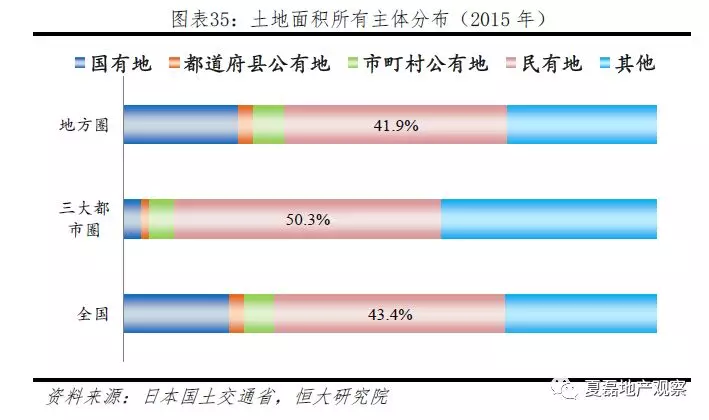 明治维新启动土地改革后,逐渐形成以私有为主的多元土地所有制。1868年以前,日本土地为幕府、大名及家臣等封建领主所有,土地不得买卖;1869年,明治政府宣布私人可拥有土地;1872年正式废除《禁止天地永久买卖法令》,承认土地私有,允许土地买卖。目前基本形成以私有为主、国家和公共所有并存的多元土地所有制。2015年,全国、三大都市圈和地方圈的私人土地占比分别为43.4%、50.3%和41.9%,国有和公有土地占比分别为28.3%、9.5%和30.2%;扣除产权不明晰和水域面积的“其他”土地,全国土地面积中私有土地占比60.5%,国有和公有占比39.5%,而三大都市圈私人土地占比更高。