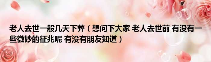 导读 大家好,今天小六子来为大家解答以下的问题,关于老人去世一般几天下葬,想问下大家 老人去世前 有没有一些微妙的征兆呢 有没有朋友知道